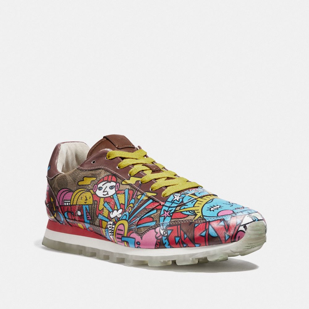 For this limited edition footwear collection, Coach collaborates with five global talents to create dynamic original artwork featuring our Signature. Crafted of sturdy canvas, our 1970s-inspired C118 running shoe features an intriguing graphic illustration by Singapore-based visual artist "Mindflyer”.