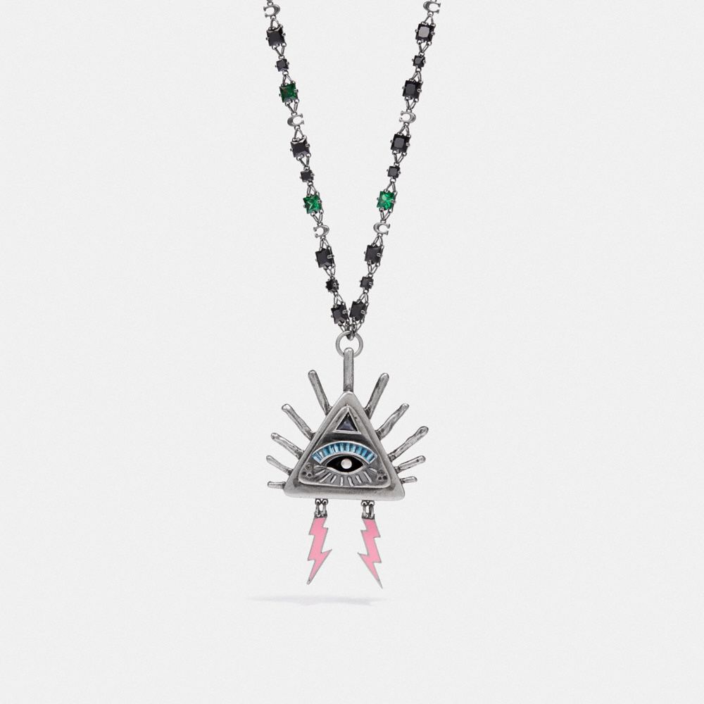 Featuring a mystical all-seeing eye motif, this pendant necklace makes a major impression. Crafted of plated brass with polished enamel details, it’s finished with a Signature-and-stone chain.