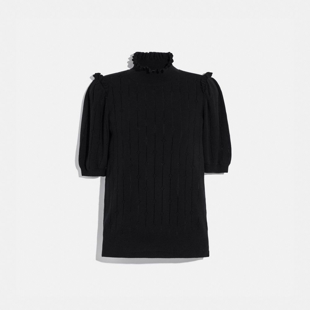 This short sleeve turtleneck sweater features an allover pointelle knit for a lacy effect. Crafted of soft wool, it’s finished with ruffle detailing at the shoulders and cozy ribbed trim.