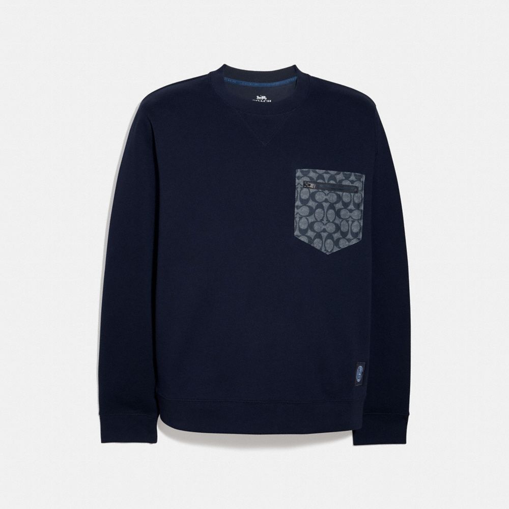 Play the blues with this classic-fit sweatshirt featuring our lightweight Signature chambray on the zip chest pocket. Crafted of soft cotton, it’s finished with cozy ribbed knit trim and our woven Coach retro graphic at the hem.